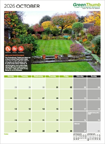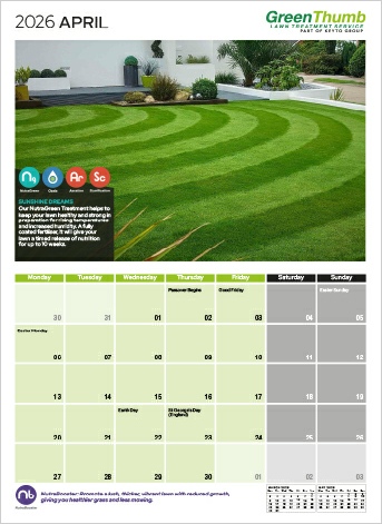 GreenThumb required a design for their annual calendar. The top section was devoted to a large format image of a customer’s lawn along with promotional details of the Treatment Programmes available. The base section had a large legible calendar that incorporated both previous and future months along with notable dates.