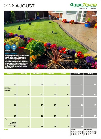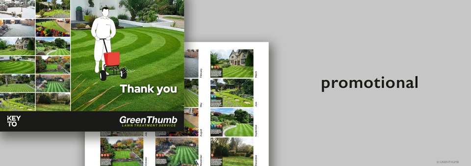 GreenThumb required a design for their annual calendar. The top section was devoted to a large format image of a customer’s lawn along with promotional details of the Treatment Programmes available. The base section had a large legible calendar that incorporated both previous and future months along with notable dates.