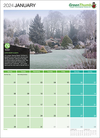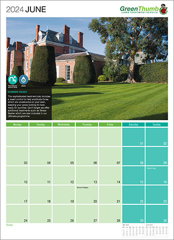 GreenThumb required a design for their annual calendar. The top section was devoted to a large format image of a customer’s lawn along with promotional details of the Treatment Programmes available. The base section had a large legible calendar that incorporated both previous and future months along with notable dates.